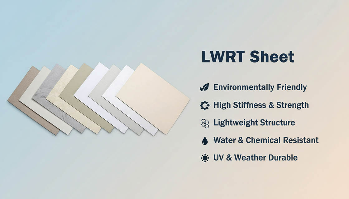 Lightweight Reinforced Thermoplastic (LWRT) Sheets combine glass fibers and polypropylene fibers in a 50:50 mass ratio, part of the Glass-Mat Reinforced Thermoplastics (GMT) family. This combination leverages glass fiber structural reinforcement with polypropylene’s thermoplastic properties.